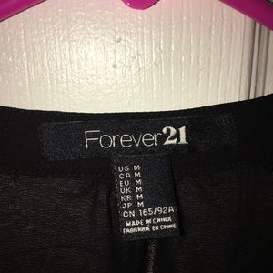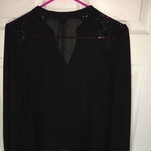 Black blouse. See through sheer material. Very nice. I did notice while taking the picture that it is missing a button but other than that it’s in brand new condition