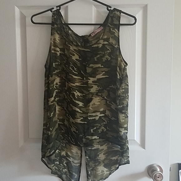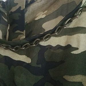 Camouflage print sleeveless summer top with chain neckline..button down in back with split opening for added cool, comfort and sexiness sheer and lightweight