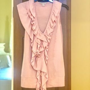 Cute pink frilly top with fabric detail along front and wider right shoulder.