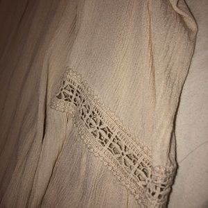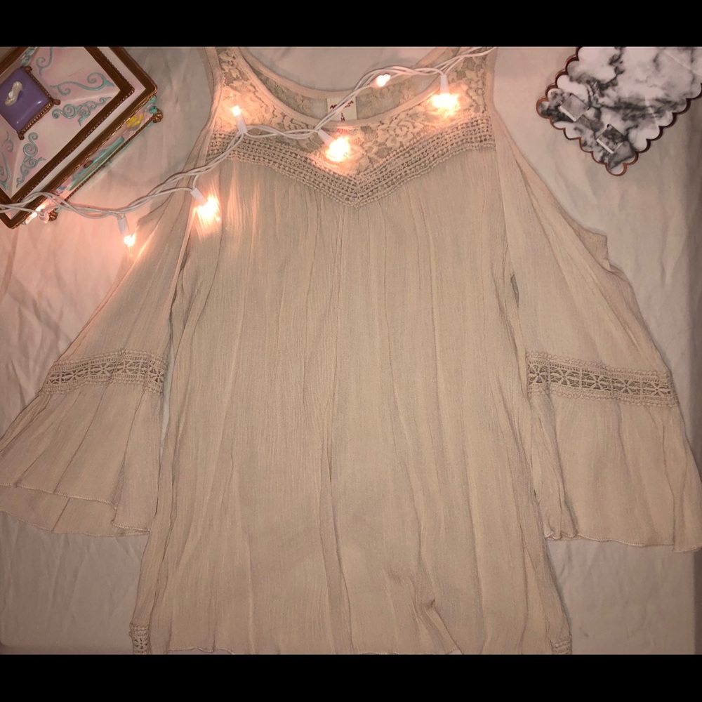 Creamy colored blouse. Off the shoulders.