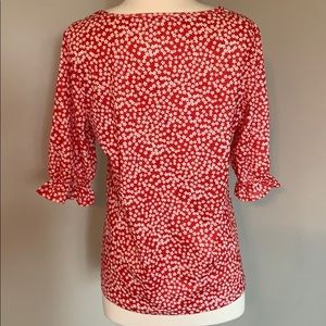 Floral printed red blouse. NWOT. Polyester. V Neck. Short sleeve w/elastic. Sleeve length 13.4” Bust 36.2” Length 22.6”
