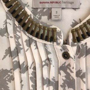 Grayish beige and cream tones, polyester blouse fabric. Metal detailing around collar. Good for first trimester.