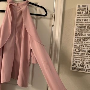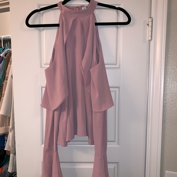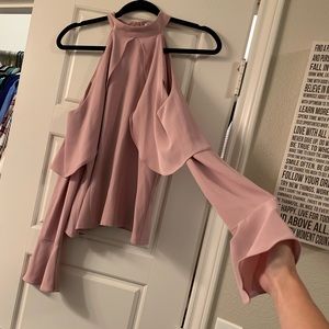 Pretty light gray pink blouse!! Worn once. There is a slight stain on the back of a sleeve. I’ve put a picture of it, it’s the last picture. Open shoulder. I’d say it runs a little small if you have boobs bigger than size C cup.