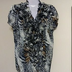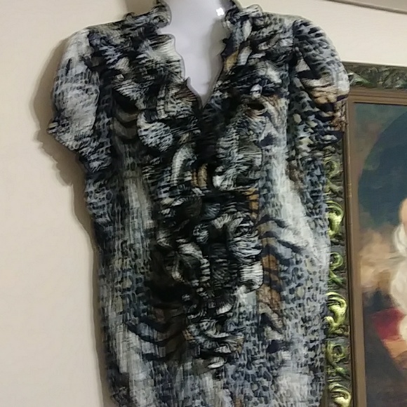 Beautful cool crisp machine washable silky feminine blouse.Has gray, black, tan and white colors in it.