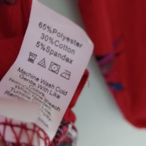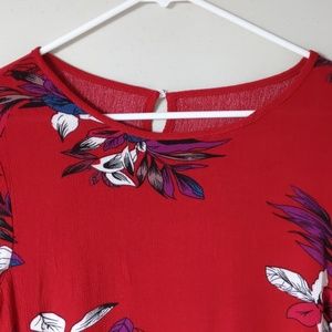 Beautiful purple, blue and white floral on red background.peblum blouse. Slightly hi/lo cut. Flowy. Cute. Get ready for compliments!