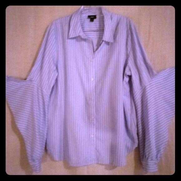 Light blue and white stripe blouse shirt. Sleeves flare and is open at the elbow down. Button cuff.