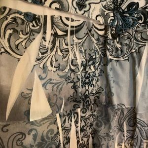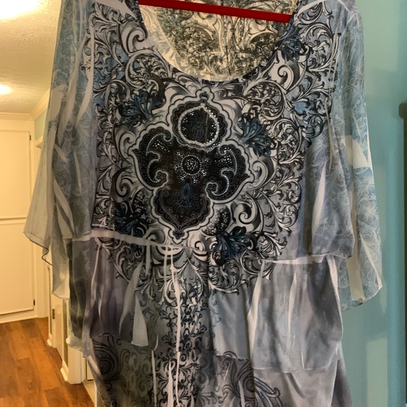 Light blue and white design scarf like layered look. 3/4 sleeves and rhinestone front.