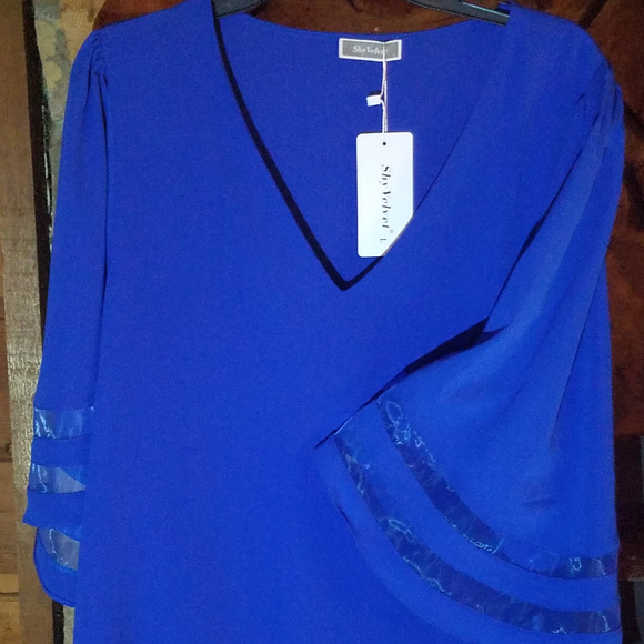 V Neck pull over blouse of 100% Crepe Polyester, 3/4 length bell sleeves with net inset stripes, lightweight and very comfortable, Royal Blue