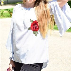 Light blue with flower detail. Super cute everyday blouse, perfect for summer/spring.