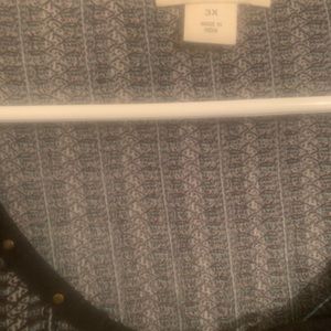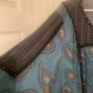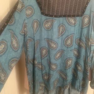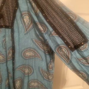 Blue long sleeve shirt with black print and black trim on front sleeves and back. Very comfortable worn once