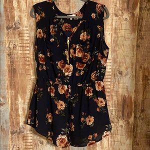 Stella Tweed blue sleeveless blouse with flower detail. Zipper front with 2 pockets