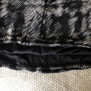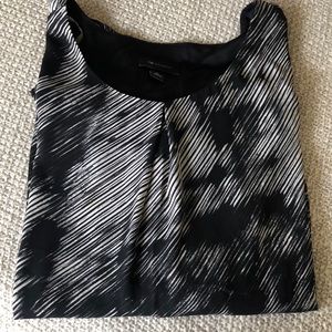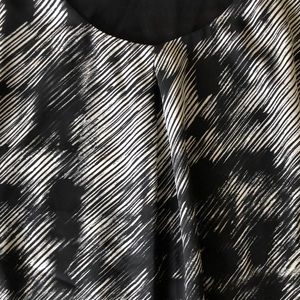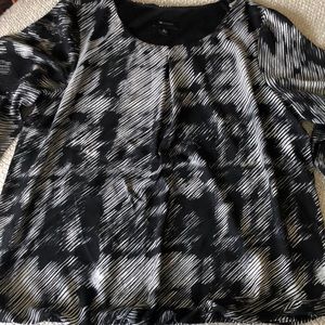 Black and white blouse with elastic waistline. Long angled sleeves.