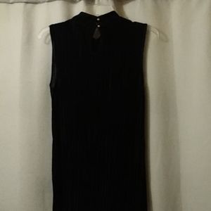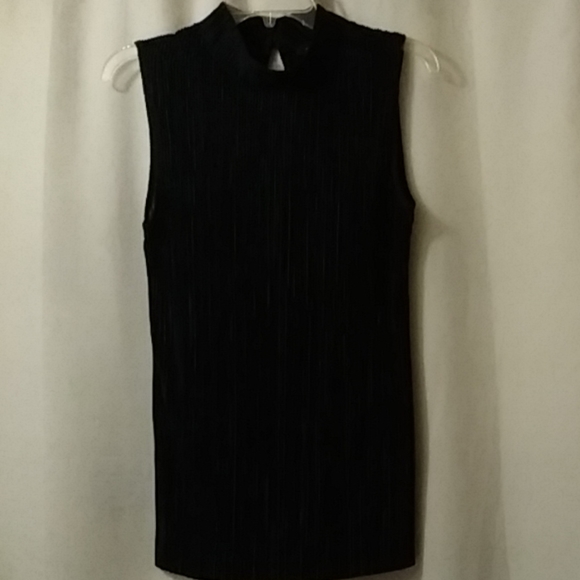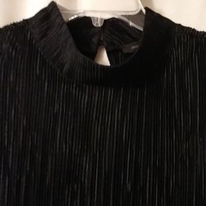 Soft, black crepe, with mock turtle neck. 100% polyester. Gold colored buttons accent the nevk on the backside.