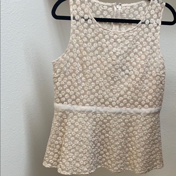 Beautiful neutral blouse with beautiful flowers and a nice ribbon at the waist line.