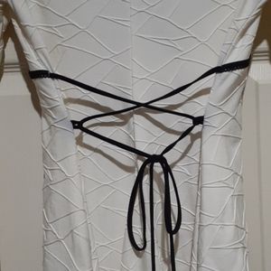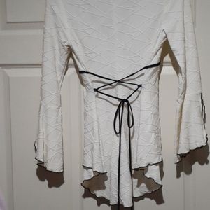 White v-neck blouse with black trim, flare arms criss cross tie on back.x-large