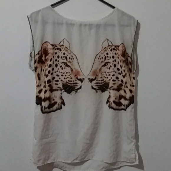 White blouse with cheetah / leopard design by Paper Tee size M