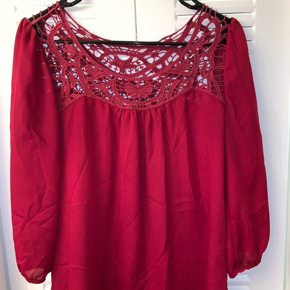 Red lightweight top with 3 quarter length sleeves and a crocheted neck. (It needs to be steamed to remove the wrinkles!)
