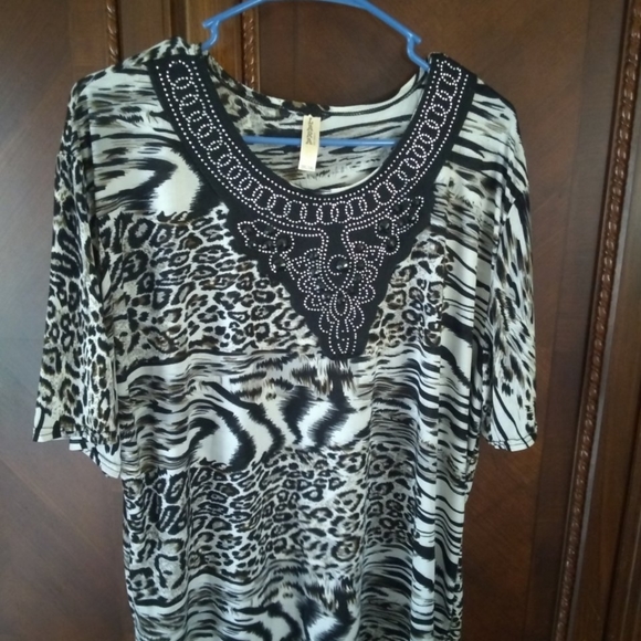Pretty black leopard and stripe print. Short sleeve with beaded neckline.