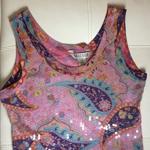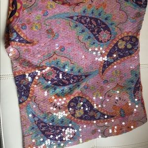 Pinky blouse with colorful patterns. Clear sequin on fro t of the blouse onlyUsed in perfect condition.