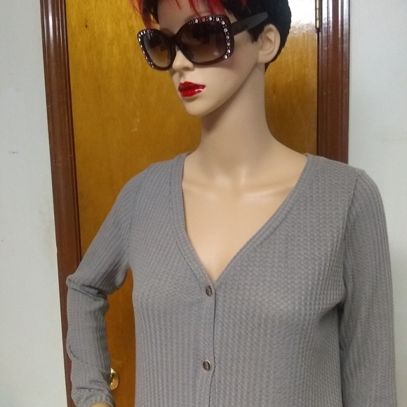 31" long from shoulder down stretchy fabric 4 front buttons long sleeves bottom ties
