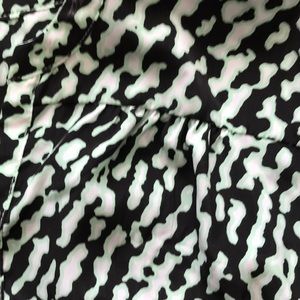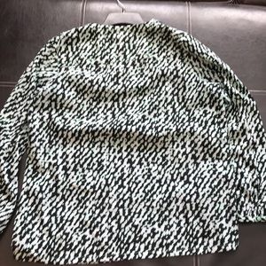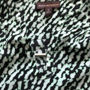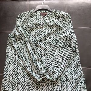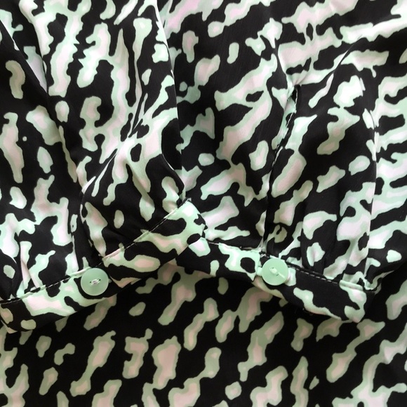 Very soft blouse with cuffed sleeves buttons are still intact and I’m perfect condition. Has a small plunge with cross bar. Is actually professional looking and non-revealing I was able to wear it at the office.