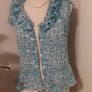 Sleeveless, button up blouse. Designed by Sunny leigh, Ruffled at the collar and made of