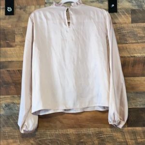 Very light pink, slightly puffy, long sleeve blouse...flared bottom. 100% polyester. Very pretty… Worn only once.