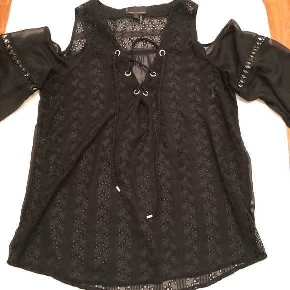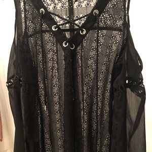Casual or dressy Sheer, flowy blouse, open shoulders 8.5 inches, length is 25inches, waist is 22 inches, sleeves are 20 inches.