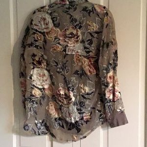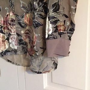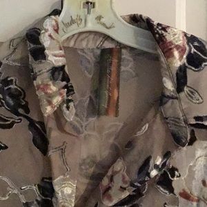 Aratta long sleeve see through floral blouse. Pull over v-neck blouse with one snap closure. Beautiful shimmery accent. Great with jeans or dress it up with a skirt. No size listed.