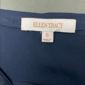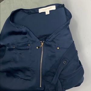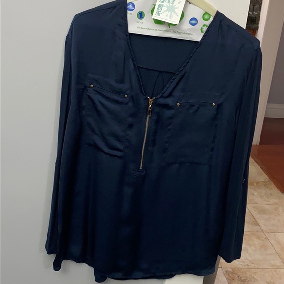 Navy blue front polyester, back rayon with top front gold zipper, adjustable sleeves. Two front pockets for design with gold studs in the corners. In good condition.