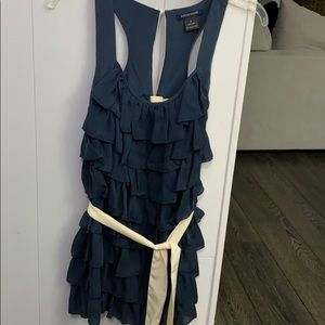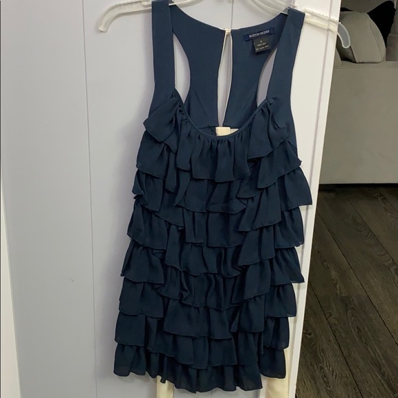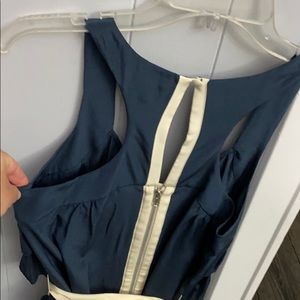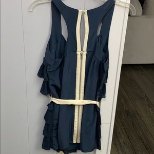Sleeveless ruffle navy blouse with off white belt, the back of the blouse silver zipper from top to bottom with off white lining detail. Very beautiful and unique. 100% Silk. Can dress up or casual. In great condition like new.
