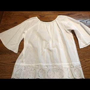 White 100%cotton blouse. Baby pleats at neckline and flounce lace with scalloped hem. Cool for the summer. Versatile.