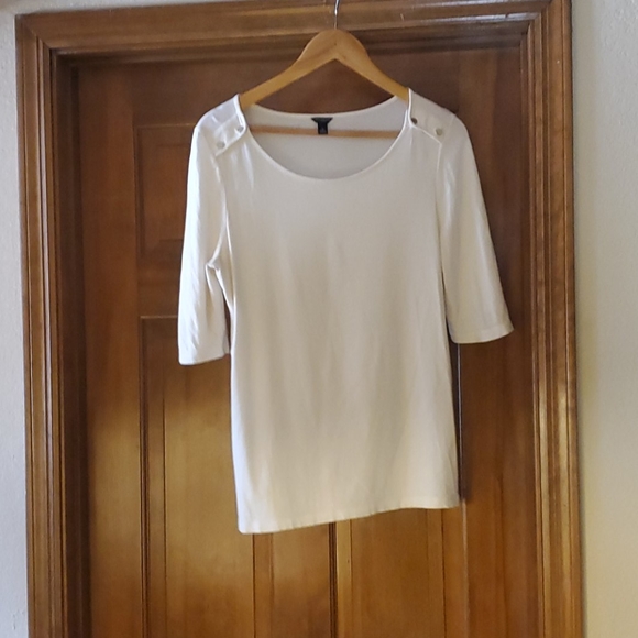 White blouse with 3/4 sleeves, snaps on shoulder