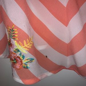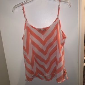 Pink and white chevron striped flowy blouse. It says large on the tag but I usually wear a small in all tops and it still fits me fine. Has a tiny little black mark shown in the picture