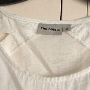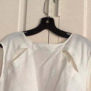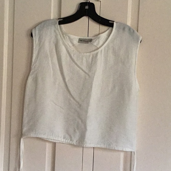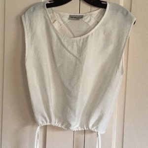 Very simple and elegant white crop top. Great for layering or wearing alone. Slight cap sleeve with tie bottom. Nice peek-a-boo detail in the back. Rayon and nylon. Suggested dry clean.