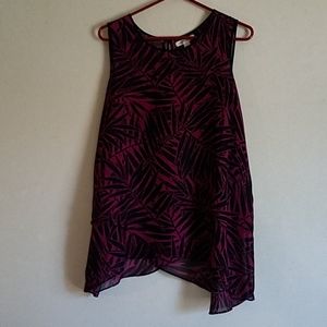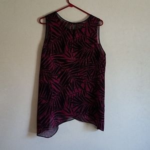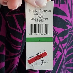 JohnPaulRichard black and purple blouse. It's lightweight and flowy. I removed the price tag to wash it for an interview. I ended up wearing a different top for my interview, so it hasn't been worn. It is in excellent condition! The first picture best shows the real colors: black palm leaves with a magenta background. It's very cute!