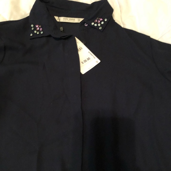 Sheer navy blue blouse with crystal stone decor on collar and sleeves