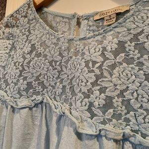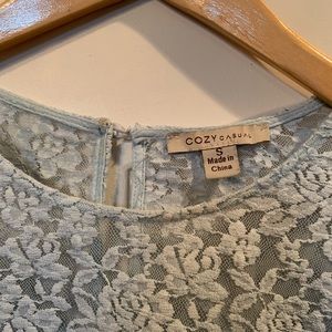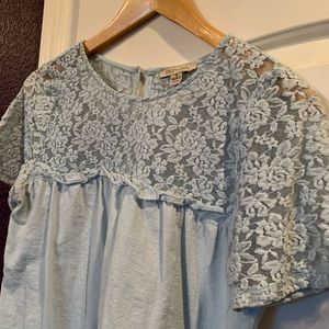 Baby blue colored blouse with lace accents. The lace section is a mesh material so it is a little bit see-through. Originally bought from a local boutique but I don’t ever wear it.. like new condition.