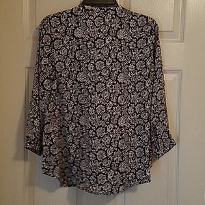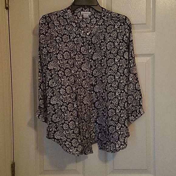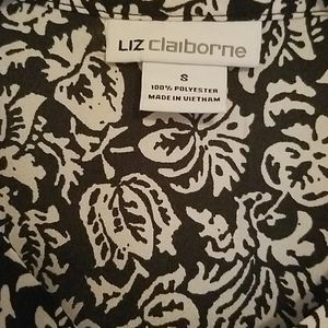 Very soft black and white pattern. Pleated front. Hidden buttons. 100% polyester.