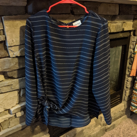 Navy and white stripe blouse, ties at the bottom for style.