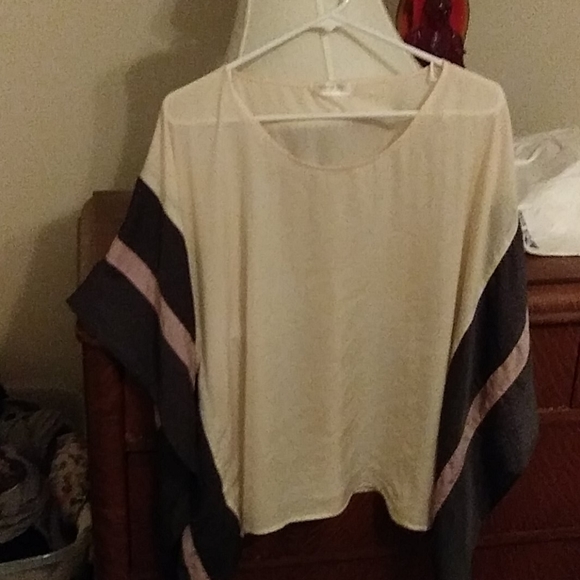 And has never been one it's made by an October Sky Hair Designs out of Los Angeles New York and Tokyo and has flowing sleeves that open at the top and the Restless leaves slow down by your side to give it a very flowing an Angelic look it is nude color with brown and a pinkish lavender stripe sleeves and it has never been worn but the tags are not on it sorry about that I get excited sometimes and just first thing I do is rip the tags off but it's very white way it's a kind of chiffon material