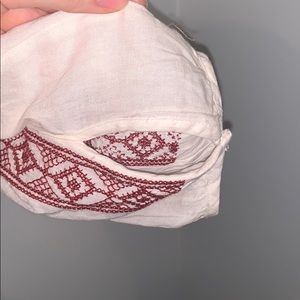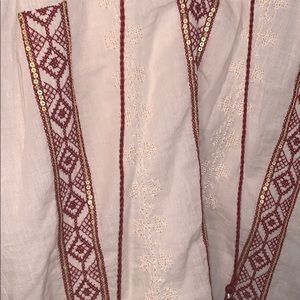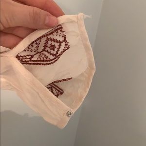 Flowy light weight blouse from American eagle it does have a missing snap on one of the sleeves but it can be easily fixed. Red detailing on the front and it is more of a cream color.