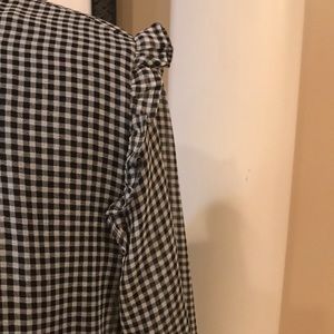 Bk and white gingham blouse detail at shoulder and neck