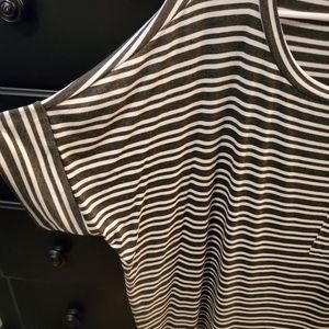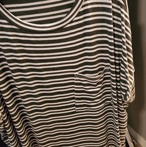 This top is a slouchy top. Relaxed fit, super soft, longer short sleeves. 96% Rayon, 4% Spandex. Super cute with short for those summer days or jeans for going out. This one is a dark grey and white brand new never worn. Have more colors as well.