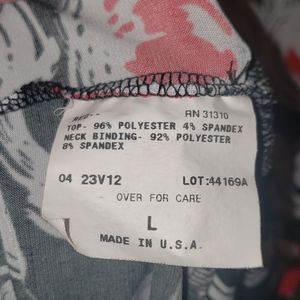 White, red and black, silver ring at neck, 3/4 length sleeves, loosely banded botton