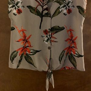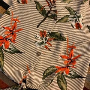 Cute striped blouse with birds of paradise, fun flirty summertime look with white jeans or shorts. Previously loved