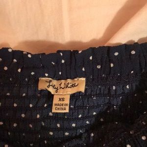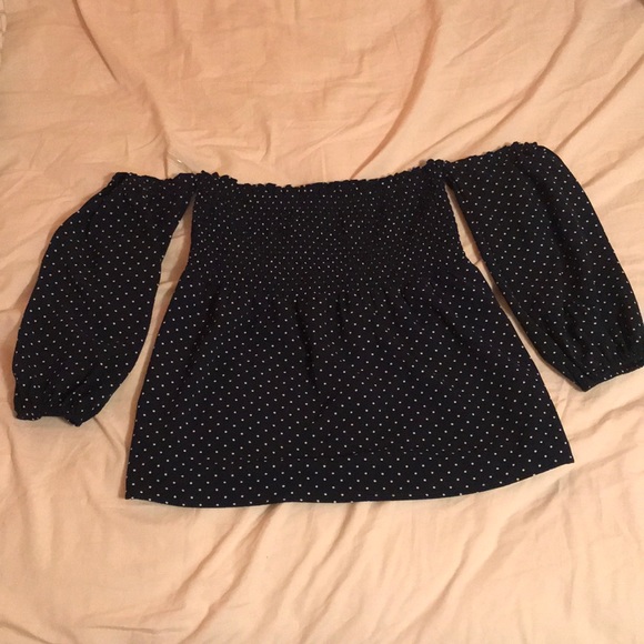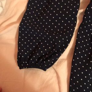 Navy white polka dot blouse, strapless look with sleeves starting at shoulder. Purchased from Charming Charlie’s!