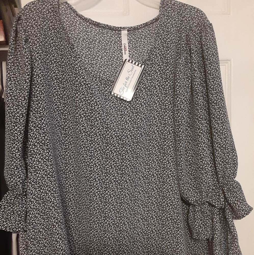 Black and white print, polyester blouse with 3/4 sleeves that have the cutest tie on the bottom!
