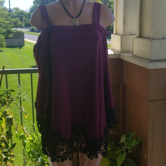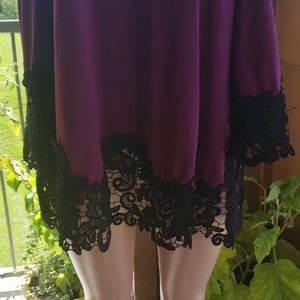 Purple peek-a-boo shoulder with bell 3/4 sleeve hemmed with black lace at the end of the sleeves and bottom of blouse. Snap on straps over the shoulder.