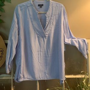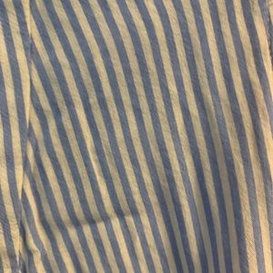 Baby blue and white striped blouse. V-neck with three-quarter length sleeves.